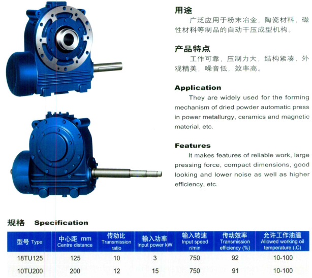 干粉壓機專用減速機采用平面二次包絡環面傳動設計,傳動扭矩大、運行平穩、噪音低,鏈接方式采用空心軸鏈接方便與干粉壓機配套安裝。