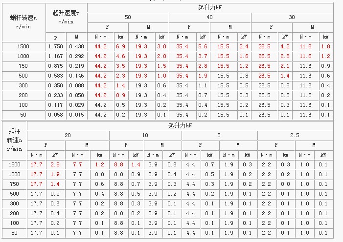 SWL5蝸輪絲桿升降機輸入功率0.1-6.9KW,按實際起重總量按下表選擇合適的輸入功率,表中的參數適用于環境溫度為20℃、工作持續率為20%h或30%/10min的條件下; 對紅色的參數,使用時螺桿會產生過熱,應嚴加注意。