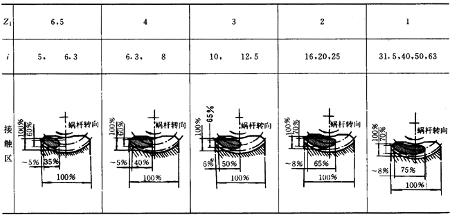 d.蝸輪齒面接觸區(qū)位置、大小應(yīng)符合表8-128的規(guī)定。雙向運(yùn)轉(zhuǎn)時(shí),蝸輪輪齒兩側(cè)接觸區(qū)對(duì)稱(chēng)對(duì)蝸輪中心平面。